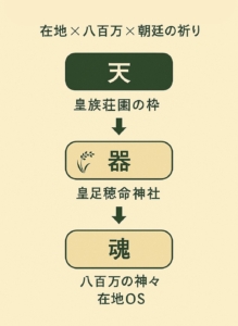 この仕組みにより、在地の国津神的な祈りと、それを束ねる中央の権威とがかみ合い、この地域は“国家OS”へと接続したのです。