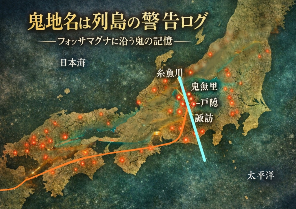 糸魚川–静岡構造線周辺には、霊性拠点や古い信仰が集中する地域も見られる。鬼地名の背景は一様ではなく、東日本では地形や境界の緊張を、西日本では製鉄・在地勢力・支配の衝突などを反映する例も指摘されている。